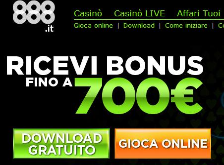 Una nuova eccezionale offerta da parte di Casino Online 888. La sala da gioco ha voluto stupire tutti, aumentando il valore del bonus, passando, già dall'interessante somma di 100 euro a 700 euro, un aumento di ben 600 euro. Grande azione di marketing per 888 casinò, che oltre ad una vasta varietà di giochi e una piattaforma eccellente, offre ai propri nuovi iscritti la possibilità di giocare sempre più gratuitamente.