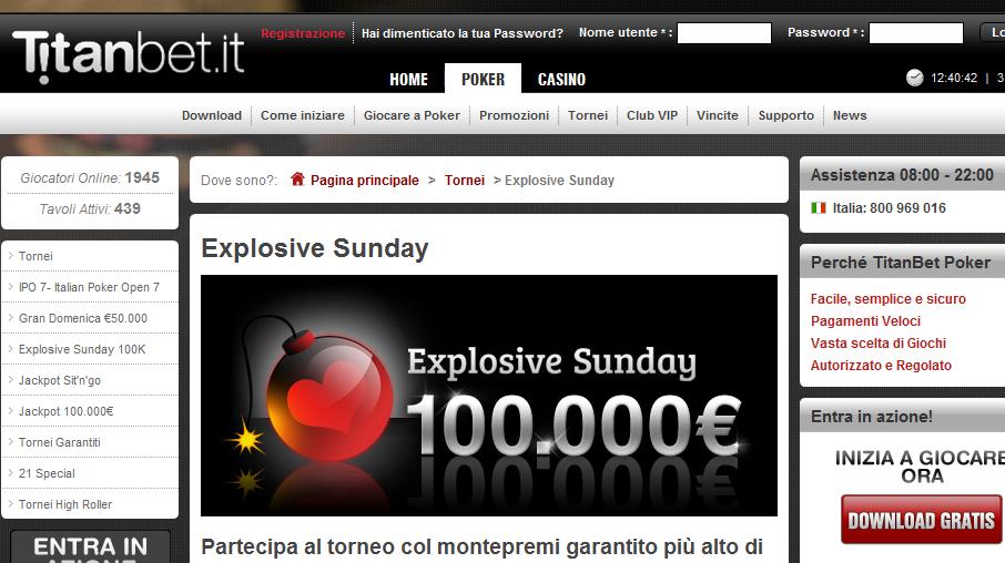 Tutti i mesi vissuti con Titanbet sia con il poker che con il casino online sono stati davvero speciali per i giocatori iscritti alla lobby, con tantissimi bonus e promozioni speciali offerte, ma giugno lo vuole essere ancora di più, un mese colmo di iniziative offerte da Titanbet Poker. Da non perdere assolutamente l'eccezionale "Explosive Sunday", un torneo con un montepremi garantito molto ricco di ben 100mila euro, un evento che avrà inizio il 3 giugno, sul poker cash game ottime le classifiche nuove!